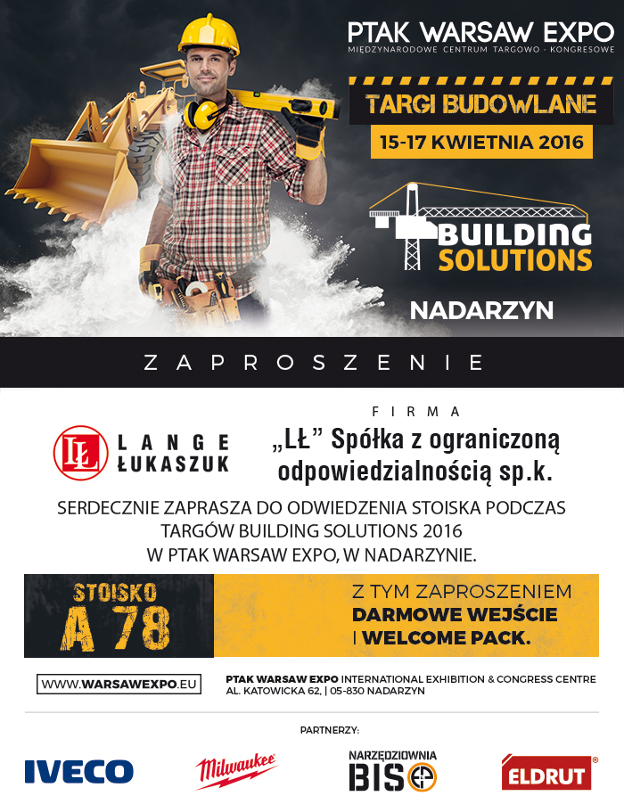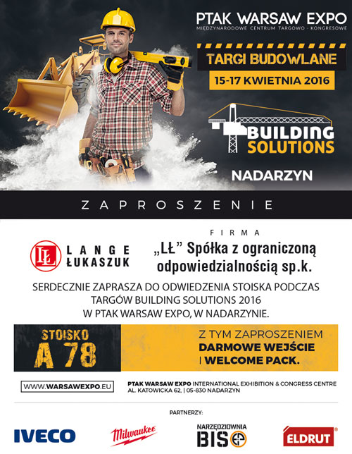 Wspólnie z naszym Partnerem firmą Lange Łukaszuk zapraszamy serdecznie na pierwsze Targi Building Solutions w Nadarzynie k. Warszawy, które odbędą się w dniach 15-17 kwietnia br. Czekamy na Państwa na stoisku A78 i w strefie pokazów (Demobus), będziemy wdzięczni za Wasze odwiedziny.